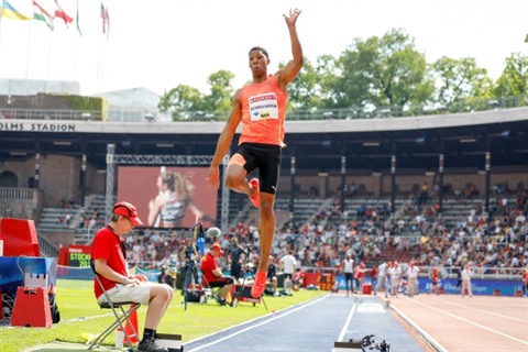 | Le sauteur en longueur cubain Juan Miguel Echevarria lors de l'étape de Stockholm de la Ligue de diamant, le 10 juin. |