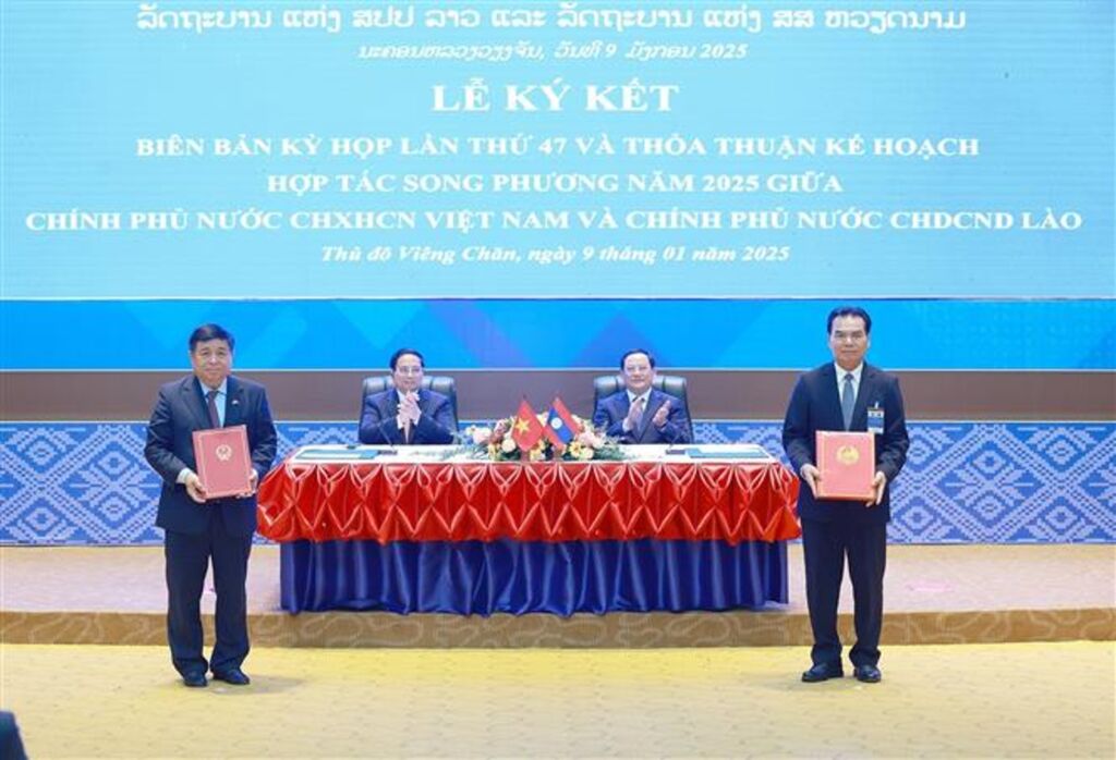 Dès la réunion, les deux Premiers ministres ont assisté à la signature et à l’échange de documents de coopération importants, notamment : le procès-verbal de la 47ᵉ réunion, l’accord sur le plan de coopération entre les deux gouvernements pour 2025, l’accord des deux gouvernements sur l’achat et la vente d’énergie électrique produite à partir du charbon, le plan de coopération pour 2025 entre le ministère vietnamien de l’Éducation et de la Formation et le ministère lao de l’Éducation et des Sports.
