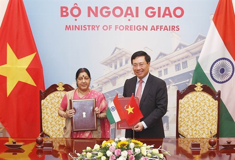 | Le vice-Premier ministre et ministre des Affaires étrangères, Pham Binh Minh, et la ministre indienne des Affaires étrangères, Sushma Swaraj. |