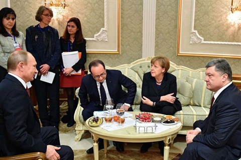 | Le président russe Vladimir Poutine, français François Hollande, la Chancelière allemande Angela Merkel et le président ukrainien Petro Porochenko, lors d’un Sommet quadripartite dans le format dit «de Normandie», en Biélorussie, le 11 février. |
