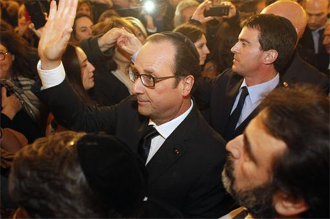 | François Hollande et Manuel Valls le 11 janvier à la grande synagogue de Paris. |