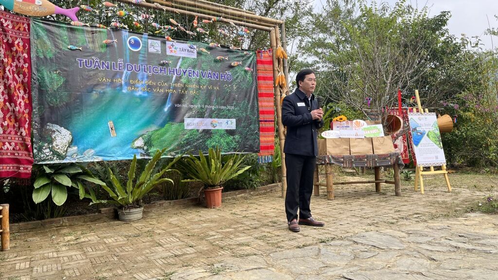 | Vu Thanh Hai, vice-président du Comité populaire du district de Vân Hô, s'exprime lors de la cérémonie d'inauguration de la Semaine touristique. |
