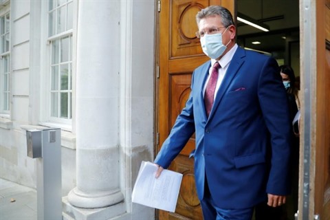 | Le vice-président de la CE, Maros Sefcovic, quitte le siège de la délégation de l'UE à Londres, le 10 septembre 2020. |