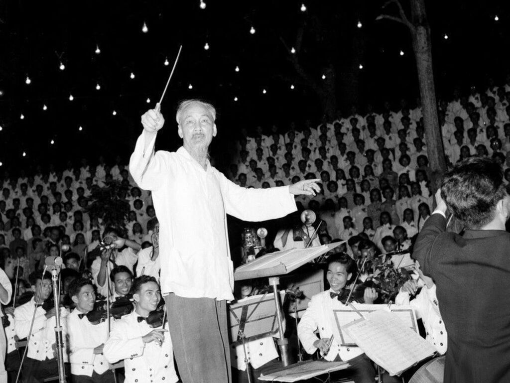 | Le Président Hô Chi Minh entonne le chant "Solidarité". |
