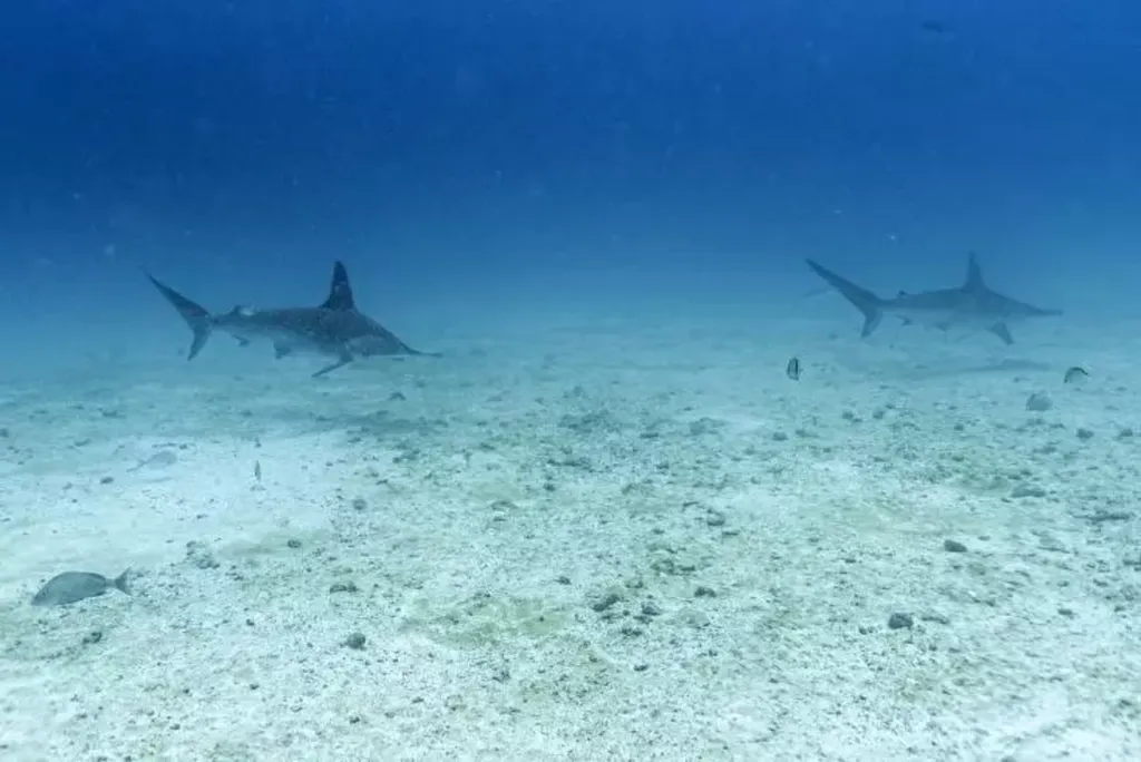 | Des requins-marteaux nagent sur le site de plongée de l'île North Seymour dans l'archipel des Galápagos, en Équateur. |