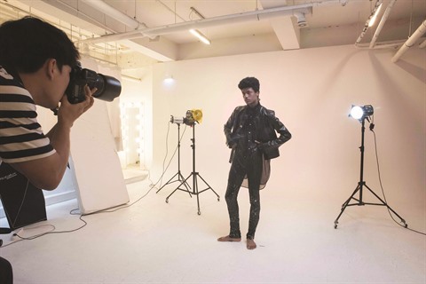 | Le modèle sud-coréen Han Hyun-Min (droite) à une séance photo dans un studio de Séoul. |