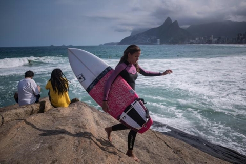 | Une surfeuse s'apprête à s'adonner à son sport sur la plage d'Ipanema, à Rio de Janiero, le 30 juillet. |