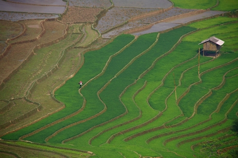 Comme nombre de Vietnamiens n’ont pas ce genre de scrupule, je vous laisse imaginer combien cela représente à la mesure du pays. Plus de 270 milliards de grains par jour... Et comme, jusqu’à présent, le riz ne se trouve pas dans les arbres ou dans la mer, il en faut des rizières, sèches ou humides, pour héberger toute cette multitude granuleuse. En longues plaines, en terrasse, sur les bords de route, dans la plus petite vallée, dans la moindre clairière, sur les flancs des montagnes et sur les rives des fleuves, elles s’étalent sans vergogne pour s’offrir aux soins des hommes. Comme des cocottes, elles se font régulièrement remettre des implants de chevelure verte qu’elles feront ondoyer au soleil, en attendant, devenue jaunissante, de la livrer aux faucilles. Puis, après un massage en profondeur, elles se prêteront de nouveau au jeu du repiquage, et ainsi de suite selon un rythme immémorial qui signe l’ancestrale histoire d’amour entre l’homme et la rizière.