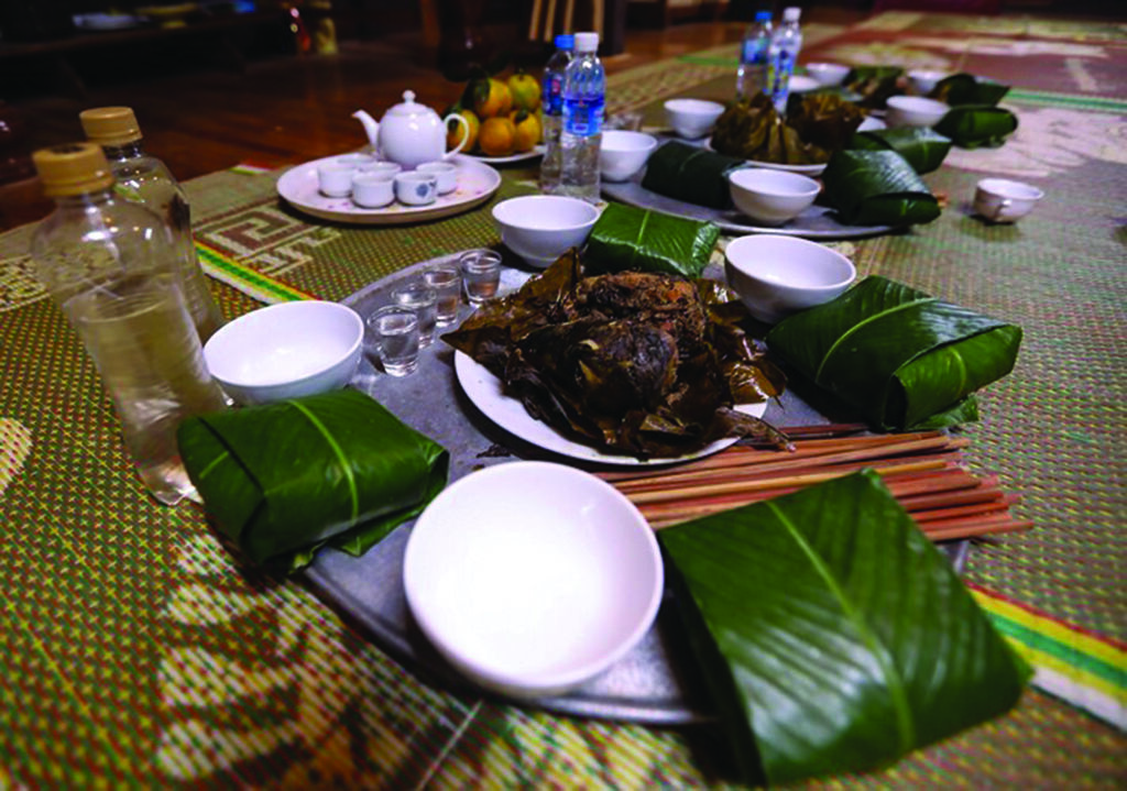 Selon une légende ancienne, le plateau d’offrandes des Thai n’inclut pas de bétail ou de volaille, mais principalement des poissons de ruisseau. Cette pratique proviendrait d’une histoire émouvante sur l’amour maternel d’une poule, poussant les habitants à remplacer les volailles par le poisson - un choix empreint d’humanité. Le poisson est préparé en deux plats, grillé et cuit à la vapeur, conservant la saveur authentique des montagnes. Le xôi, riz gluant sacré des champs, est quant à lui confectionné à partir des plus beaux épis, cuit à la vapeur, puis enveloppé de feuilles de bananier pour être offert aux ancêtres.