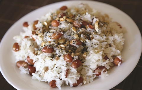 - Versez le riz dans une passoire à crépine très fine. Laissez égoutter. Ensuite, mélangez le riz et les cacahuètes avec une demi-cuillère à café de sel. Versez-les dans le bac supérieur d’une cocotte à vapeur, faites-les cuire durant 40 minutes.