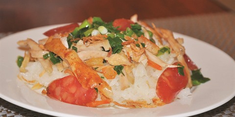 - Servez le riz sur une assiette, placez les crevettes, les saucisses chinoises, la viande de porc séchée sur le riz. Arrosez avec l’huile de ciboulette. Servez avec un petit bol de sauce soja.