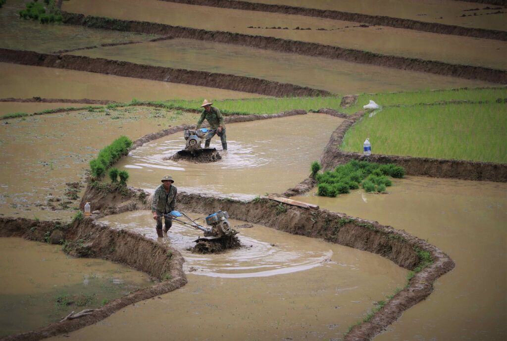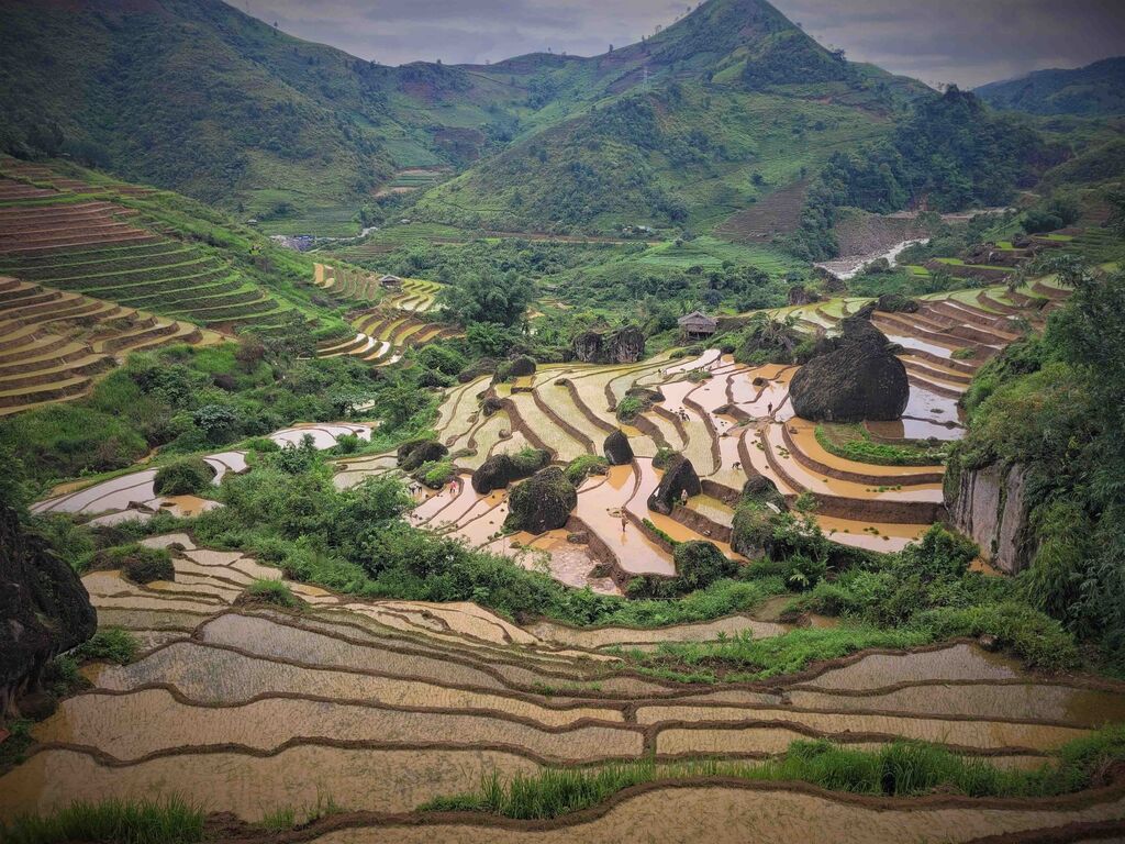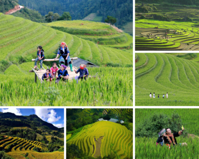 La riziculture en terrasses, forme d’agriculture sur des terres en pente familière des minorités ethniques, est une tradition des minorités ethniques dont les H’mông, dans de nombreuses provinces montagneuses du Nord. Les parcelles de terres sont étroites en largeur mais de taille suffisante pour le labour. Le champ supérieur est situé à bonne distance du champ inférieur et le dénivelé entre terrasses est de 1-1,5 m.