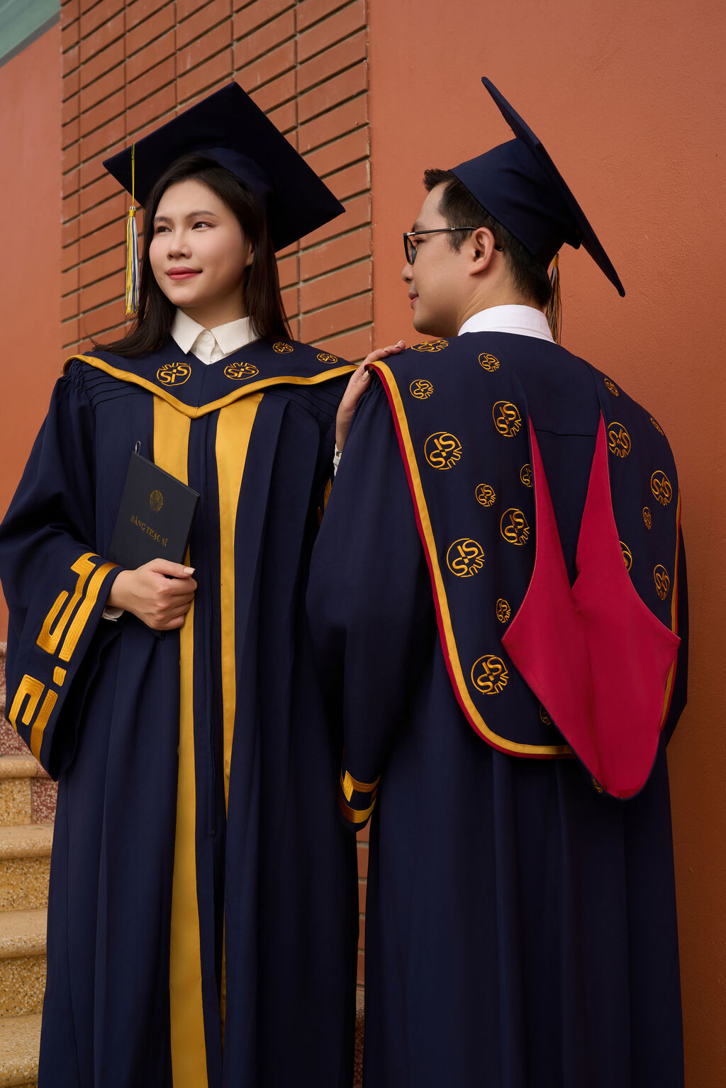 En pratique, les toges de graduation sont souvent similaires, avec des robes et chapeaux bleu anthracite et des accents rouges au niveau du col ou des manches. Certaines écoles investissent cependant dans ces tenues de manière plus élaborées comme les universités Hoa Sen et Hông Bàng, l’Université d’économie - Université nationale de Hanoï, et l’Université des sciences sociales et humaines - Université nationale de Hô Chi Minh-Ville.