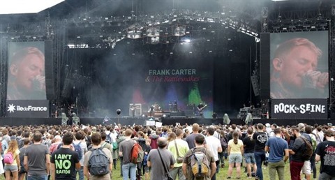 | Le groupe britannique Frank Carter & the Rattlesnakes ouvre la 15e édition du festival Rock en Seine à Saint-Cloud, près de Paris, le 25 août 2017. |
