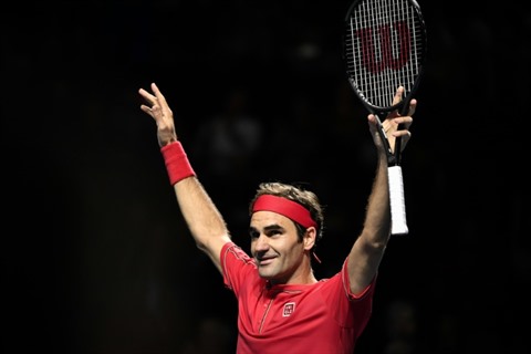 | Le Suisse Roger Federer bras levés après sa victoire face à l'Australien Alex De Minaur en finale du tournoi de Bâle, le 27 octobre. |