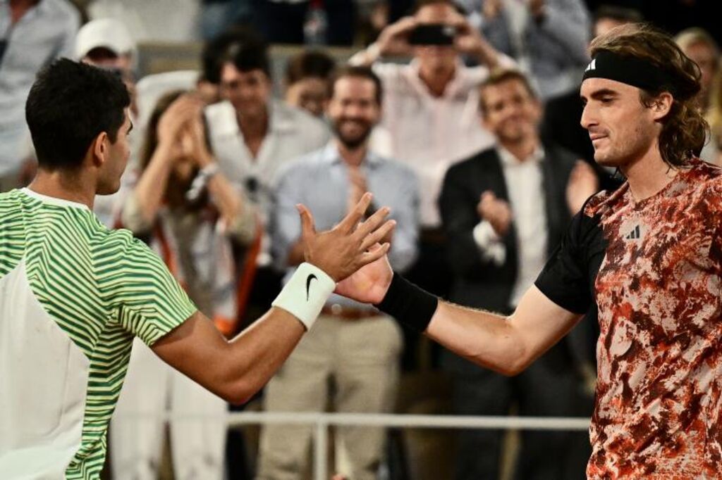 | L'Espgnol Carlos Alcaraz (gauche) salue le Grec Stefanos Tsitsipas à l'issue de leur match, le 6 juin à Roland Garros. |