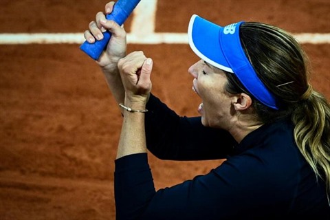 | L'Américaine Danielle Collins célèbre sa victoire en 8e de finale de Roland-Garros sur la Tunisienne Ons Jabeur le 6 octobre. |