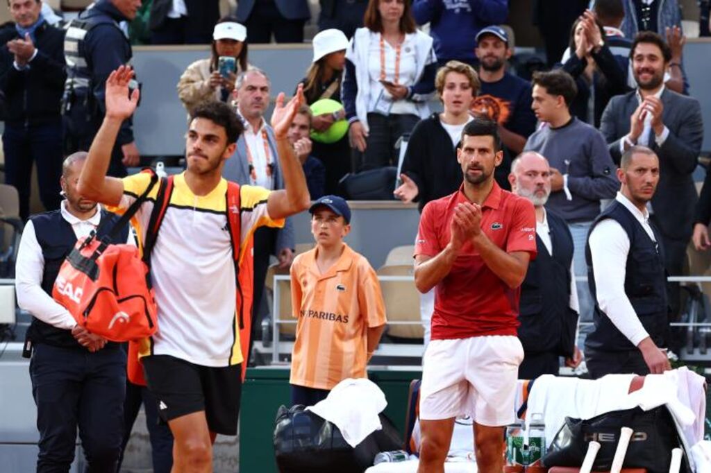 | L'Argentin Francisco Cerundolo quitte le court sous les applaudissements de Novak Djokovic après la victoire renversante du No1 mondial serbe en huitième de finale de Roland-Garros le 3 juin. |
