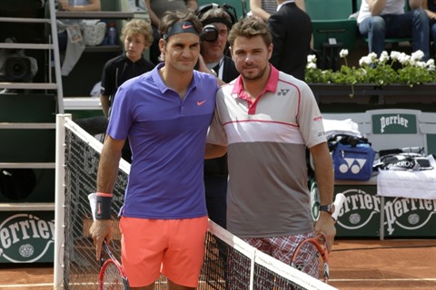 | Les Suisses Roger Federer (gauche) et Stanislas Wawrinka lors des quarts de finale de Roland-Garros, le 2 juin 2015. |