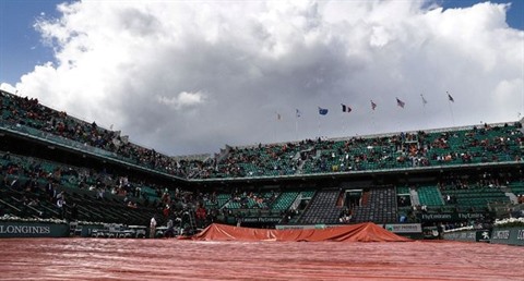 | Le court central de Roland-Garros bâché en raison d'averses, le 6 juin. |