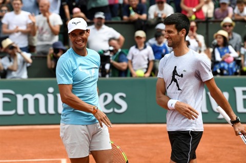 | Rafael Nadal (gauche) et Novak Djokovic le 26 mai. |