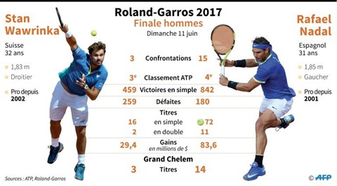 Nadal est arrivé à Paris avec un bagage très fourni : 42 matchs disputés (36 victoires), trois titres (Monte-Carlo, Barcelone, Madrid) et trois finales (Open d'Australie, Acapulco, Miami). Du côté de Wawrinka, 28 matchs seulement (20 victoires) et un titre (Genève). L'Espagnol est une place derrière le Suisse au classement ATP (3e contre 4e), mais il est premier à la "Race" (sur les seuls résultats de 2017) avec 2,5 fois plus de points que le Vaudois. Cela aura-t-il une influence sur la fraîcheur physique des finalistes ? Pas sûr. Le Suisse en est à sa troisième semaine de compétition d'affilée après avoir gagné "son" tournoi, à Genève, juste avant de venir en France. L'Espagnol a profité d'une dizaine de jours de repos après sa défaite en quart de finale à Rome le 19 mai.