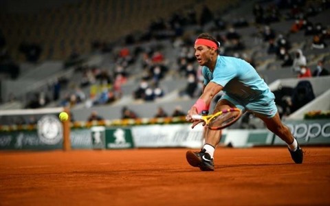 | L'Espagnol Rafael Nadal renvoie la balle au Serbe Novak Djokovic lors de leur finale masculine de tennis sur le court Philippe Chatrier à Paris, le 11 octobre 2020. |