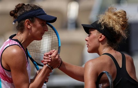 | La Roumaine Irinia-Cameélia Begu (gauche), victorieuse (6-1, 6-4) de la Française Léolia Jeanjean, au 3e tour du tournoi de Roland-Garros, le 28 mai. |
