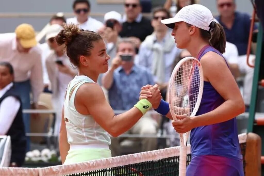 | Iga Swiatek et Jasmine Paolini se serrent la main à l'issue de la finale de Roland-Garros, le 7 juin à Paris. |