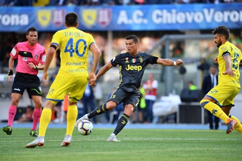 | L'attaquant portugais de la Juventus, Cristiano Ronaldo (centre), lors du match de Serie A face au Chievo, à Vérone, le 18 août. |
