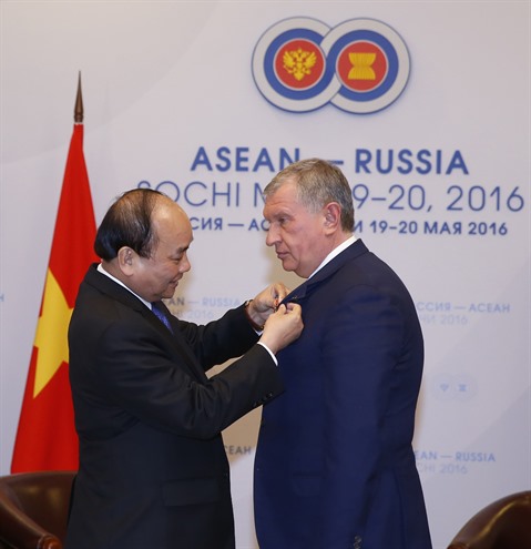 | Le responsable de Rosneft, Igor Sechin, à la rencontre avec le Premier ministre Nguyên Xuân Phuc (gauche) le 20 mai 2016. |