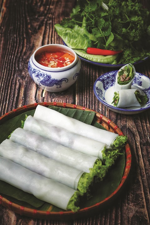 - Étaler chaque feuille de pho, disposer la salade, la coriandre, quelques herbes aromatiques et la viande de bœuf sautée. Puis les rouler.