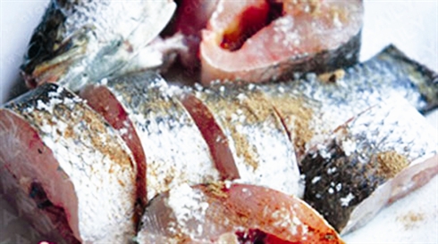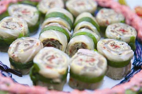 Laver les filets du poisson, les couper en minces morceaux (10 x 4 cm). Mélanger le hachis de porc avec les champignons, ajouter piment, gingembre et poivre. Préparer une «crêpe» d’œuf qui servira à enrouler le poisson. Placer la ciboulette dans l’eau bouillante. Enrouler le poisson et la viande puis cuire à la vapeur à feu doux. Placer le tout sur une assiette et ajouter coriandre et tomates pour la décoration.