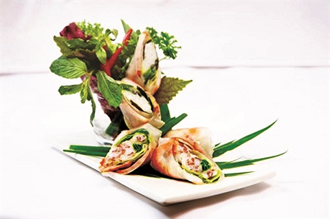 Servez les rouleaux de printemps au foie gras avec la sauce au gingembre.