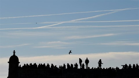 | Le public se presse sur les fortifications de Saint-Malo à la veille du départ des voiliers, le 3 novembre en France. |