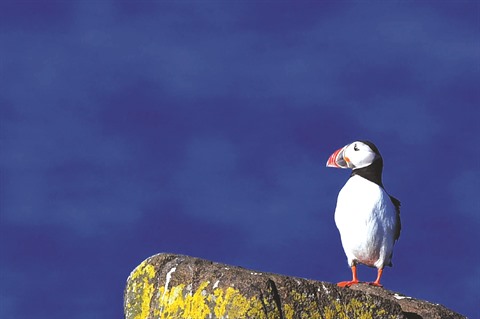 | Le macareux est un oiseau au plumage blanc et noir et au bec bariolé. |