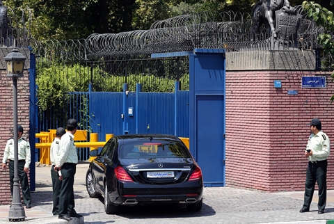 | Une voiture de la délégation britannique accompagnant le chef de la diplomatie Philip Hammond entre dans l'ambassade britannique à Téhéran, le 23 août. |