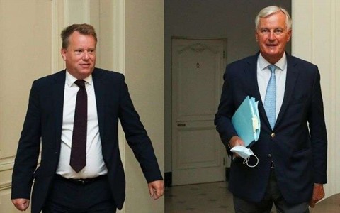 | Le négociateur britannique David Frost (gauche), et son homologue européen Michel Barnier à Bruxelles, le 21 août. |