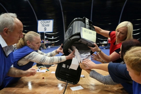 | Des bulletins de vote sont comptés à Belfast, le 23 juin 2016. |