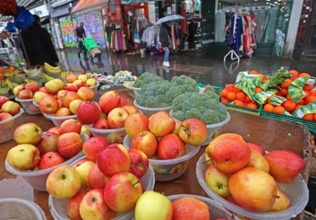| Fruits et légumes sur l'étal d'un marché dans un quartier de l'est de Londres. |