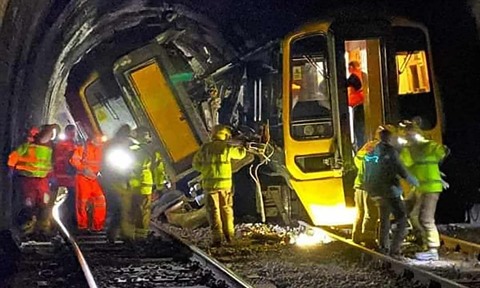 | Des secouristes britanniques sur les lieux d'une collision ferroviaire près de Salisbury, dans le Sud de l'Angleterre, dans la soirée du 31 octobre. |