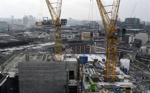 | Des grues mentionnant le nom du groupe Carillion sur un chantier à Londres, le 14 janvier. |