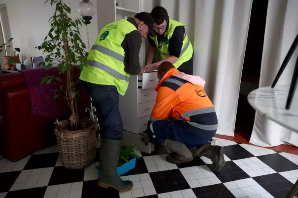 | Des agents apportent leur aide aux habitants de Saintes Charente-Maritime) confrontés aux inondations, le 20 février. |