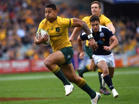 Le centre australien Israel Folau s'échappe avec led ballon lors d'un test-match contre l'Ecosse à Sydney, le 17 juin 2017. Photo: AFP/VNA/CVN |