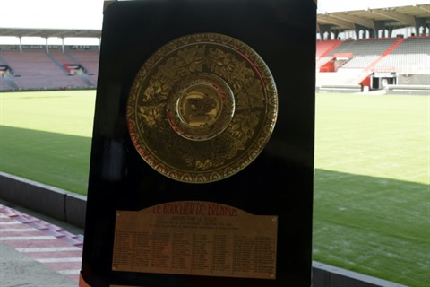 | Le bouclier de Brennus, trophée récompensant le vainqueur du Top 14, le 13 août 2019 au stade Ernest-Wallon à Toulouse. |