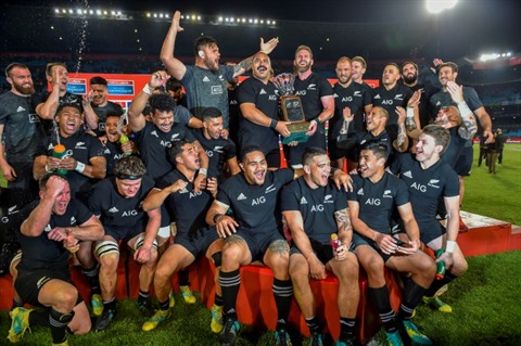 | Les Néo-zélandais fêtent leur titre dans le +Four Nations+ après leur victoire sur les Springboks le 6 octobre 2018 au stade de Loftus Versfeld à Pretoria. |