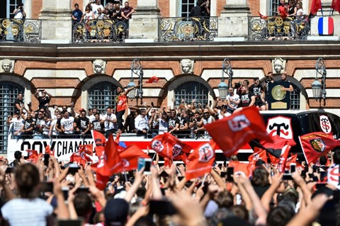| Les Toulousains vainqueurs de la finale de Top 14 arrivent place du Capitol avec le Bouclier de Brennus le 16 juin. |