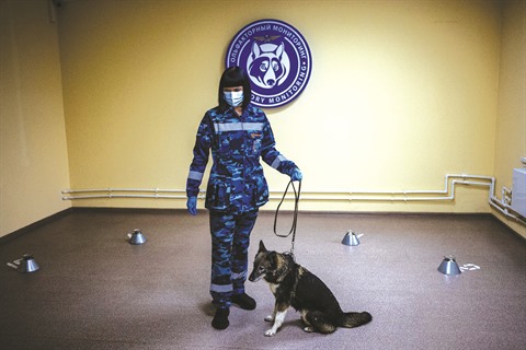Dans le laboratoire du centre de dressage canin de Khimki, au nord-ouest de la capitale, une petite chienne grise renifle une douzaine de bocaux avec des échantillons d’urine.