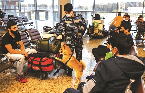 | Un "chien-chacal" entraîné à détecter le coronavirus au Centre de dressage de la Compagnie aérienne Aeroflot, près de Moscou. |
