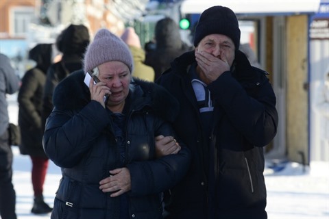 | Des proches des mineurs tués dans l'accident meurtrier, près de l'entrée de la mine de Listviajnaïa, dans la région sibérienne de Kemerovo, le 26 novembre. |
